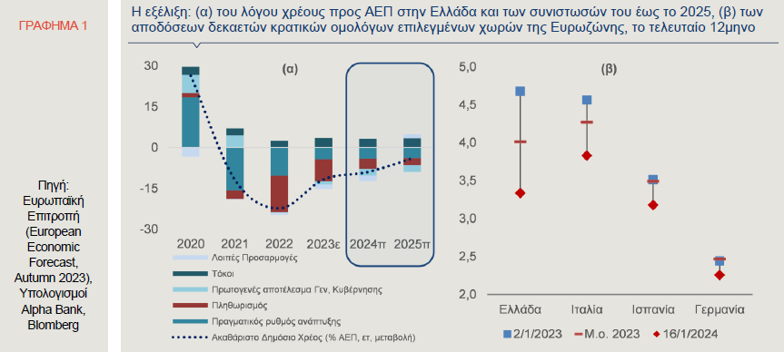 Τα ευνοϊκά χαρακτηριστικά του χρέους και η δημοσιονομική αξιοπιστία, όπως αποτυπώνεται στην επίτευξη πρωτογενών πλεονασμάτων και στην αποκλιμάκωση του λόγου χρέους προς ΑΕΠ, αποτέλεσαν, μεταξύ άλλων, βασικούς παράγοντες για την ανάκτηση της επενδυτικής βαθμίδας, βελτιώνοντας περαιτέρω τους όρους δανεισμού του ελληνικού Δημοσίου από τις διεθνείς αγορές. Η ανάκτηση της εμπιστοσύνης τον αγορών στην ελληνική οικονομία αντανακλάται ήδη στις αποδόσεις των κρατικών ομολόγων. Όπως παρατηρείται στο Γράφημα 1β, η απόδοση του ελληνικού δεκαετούς ομολόγου, στις αρχές του έτους (3,3%), ήταν χαμηλότερη από αυτήν του αντίστοιχου ιταλικού ομολόγου (3,8%) και προσέγγισε την απόδοση του δεκαετούς ισπανικού ομολόγου (3,2%). Επιπλέον, η μέση απόδοση του ελληνικού ομολόγου (4%) πέρυσι διαμορφώθηκε σε χαμηλότερο επίπεδο από αυτήν του δεκαετούς ιταλικού ομολόγου (4.3%). Τέλος, σε σύγκριση με τις επιλεγμένες χώρες της Ευρωζώνης που απεικονίζονται στο Γράφημα 1β, η πτώση της απόδοσης του ομολόγου του ελληνικού Δημοσίου ήταν η εντονότερη, ίση με 134 μονάδες βάσης, έναντι 73 της Ιταλίας, 34 της Ισπανίας και 19 της Γερμανίας (σύγκριση 2.1.2023-16.1.2024). Ως εκ τούτου, η διαφορά απόδοσης (spread) με το γερμανικό δεκαετές ομόλογο μειώθηκε, το τελευταίο δωδεκάμηνο, από τις 224 μ.β. στις 108 μ.β.