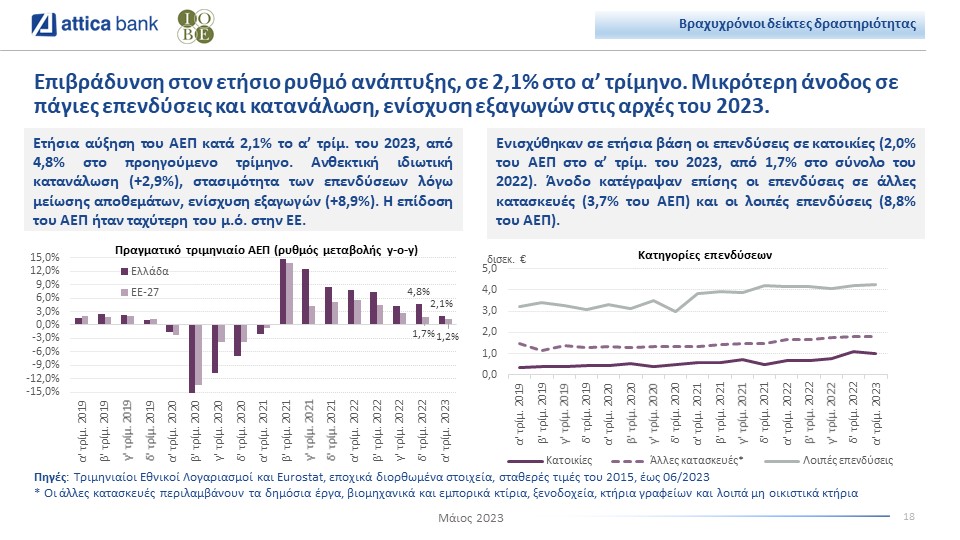 - Βραχυχρόνιοι δείκτες δραστηριότητες, όπως η βιομηχανική παραγωγή, η οικοδομική δραστηριότητα και το λιανικό εμπόριο καταγράφουν κόπωση στο τέλος τους πρώτου τριμήνου του 2023.