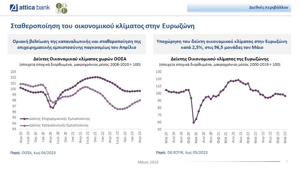 Καθώς η παγκόσμια οικονομική δραστηριότητα έχει επιβραδυνθεί, οι πληθωριστικές πιέσεις σταδιακά υποχωρούν, αν και με αργό ρυθμό. Ο προγραμματισμός νοικοκυριών και επιχειρήσεων δυσχεραίνεται από εστίες αβεβαιότητας, όπως ο συνεχιζόμενος πόλεμος στην Ουκρανία και οι ιδιαίτερα υψηλές τιμές σε αγαθά πρώτης ανάγκης, σύμφωνα με το Attica Economic Review Μαΐου 2023 με τίτλο «Ενίσχυση εμπιστοσύνης, αλλά με τάσεις επιβράδυνσης της οικονομίας», το οποίο συντάσσεται από την Attica Bank σε συνεργασία με το ΙΟΒΕ.