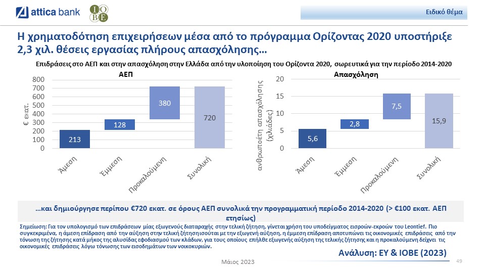 Η οικονομετρική ανάλυση έδειξε ότι οι ελληνικές επιχειρήσεις που έλαβαν χρηματοδότηση από το πρόγραμμα Ορίζοντας 2020 έχουν υψηλότερο κύκλο εργασιών και περισσότερους εργαζόμενους, σε σύγκριση με ανάλογες επιχειρήσεις που δεν έλαβαν χρηματοδότηση από το πρόγραμμα. Εκτιμάται ότι η χρηματοδότηση επιχειρήσεων μέσα από το πρόγραμμα Ορίζοντας 2020 υποστήριξε 2,3 χιλ. θέσεις εργασίας πλήρους απασχόλησης και δημιούργησε περίπου €720 εκατ. σε όρους ΑΕΠ συνολικά την προγραμματική περίοδο 2014-2020.