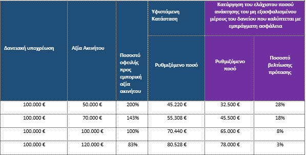 – Βελτιώνεται, με υπουργική απόφαση που θα εκδοθεί αμέσως μετά την ψήφιση του νομοσχεδίου, ο αλγόριθμος από τον οποίο προκύπτει το ύψος της διαγραφής οφειλών και κατ΄ επέκταση το ύψος της οφειλής που ρυθμίζεται μέσω του εξωδικαστικού, για το σύνολο των οφειλετών που έχουν δάνεια με εμπράγματη εξασφάλιση και όχι μόνο τους ευάλωτους. Συγκεκριμένα, με τις αλλαγές που επέρχονται, το ύψος της ρυθμιζόμενης οφειλής από δάνεια με εμπράγματη εξασφάλιση μειώνεται έως και κατά 28% σε σχέση με την υφιστάμενη κατάσταση. Ακολουθούν παραδείγματα δανείων με εξασφάλιση, με το υφιστάμενο και το νέο πλαίσιο.