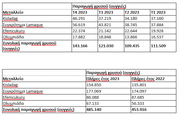 Η παραγωγή του τέταρτου τριμήνου ήταν εύρωστη σε όλες τις παραγωγικές μονάδες και εναρμονισμένη με την προσδοκία της Εταιρείας για ένα ισχυρότερο δεύτερο εξάμηνο το 2023. Η παραγωγή ολόκληρου του έτους (προκαταρκτικά αποτελέσματα) βρέθηκε στο μέσο του πιο μετριοπαθούς στόχου που είχε τεθεί και κυμαινόταν από 475.000 έως 495.000 ουγγιές, όπως ανακοινώθηκε στο δελτίο τύπου με τα αποτελέσματα του τρίτου τριμήνου του 2023. Στον ακόλουθο πίνακα παρουσιάζεται αναλυτικά η παραγωγή ανά μονάδα για το σύνολο του έτους: