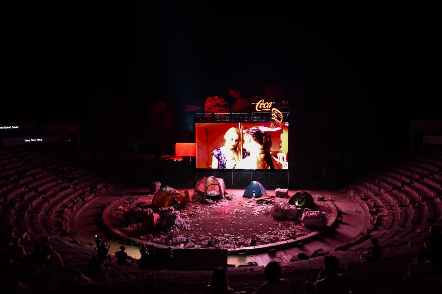 Μας ξάφνιασε και η, στην δεξιά άκρη της γιγαντοοθόνης ανάρτηση ενός ξεχαρβαλωμένου φωτεινού διαφημιστικού λογοτύπου της coca kola (άμεση αναφορά στην πολυεθνική της επιβολή και εξάρτηση που προκαλεί η από την άλλη, στην ιδεατή, ουτοπική κατάρρευση της και αυτής της επιθυμητής (με πολλά ερωτηματικά) διάλυσης του Καπιταλισμού;), όπως και το σκηνικό (Aleksandar Denic) που αποτελείτο από αντίσκηνα κάμπινγκ ( σαφής αναφορά στους ασφυκτικούς, αφιλόξενους χώρους υποδοχής προσφύγων ) και όλη η ορχήστρα γεμάτη με κάθε λογής και μεγέθους πλαστικά μπουκάλια (εικαστική αναφορά, υποθέτω, στον κατακλυσμό του πλανήτη από το πλαστικό και την τεραστία οικολογική επιβάρυνση που δημιουργεί στο περιβάλλον), φωτισμένα υποβλητικά από τον σχεδιασμό του Lothar Baumgarte.