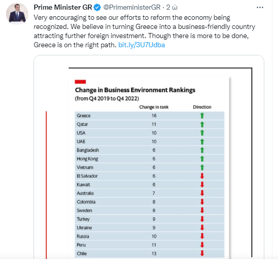 Την ικανοποίησή του εξέφρασε ο πρωθυπουργός Κυριάκος Μητσοτάκης για την ανοδική πορεία της χώρας μας στην κατάταξη του επιχειρηματικού περιβάλλοντος, όπως καταγράφεται σε έκθεση του EIU (Economist Intelligence Unit), το οποίο είναι το τμήμα έρευνας και ανάλυσης του Ομίλου Economist.