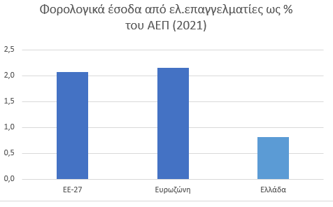 -Και πάλι λόγω του προβλήματος της φοροδιαφυγής, σύμφωνα με την ετήσια έκθεση της Ευρωπαϊκής Επιτροπής για τη φορολογία (https://taxation-customs.ec.europa.eu/taxation-1/economic-analysis-taxation/data-taxation-trends_en) τα έσοδα από τη φορολογία των ελεύθερων επαγγελματιών το 2021 αντιστοιχούσαν στο 0,8% του ΑΕΠ έναντι 2,1 % που είναι ο μέσος όρος στην ΕΕ.