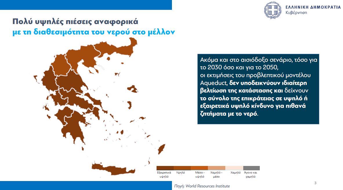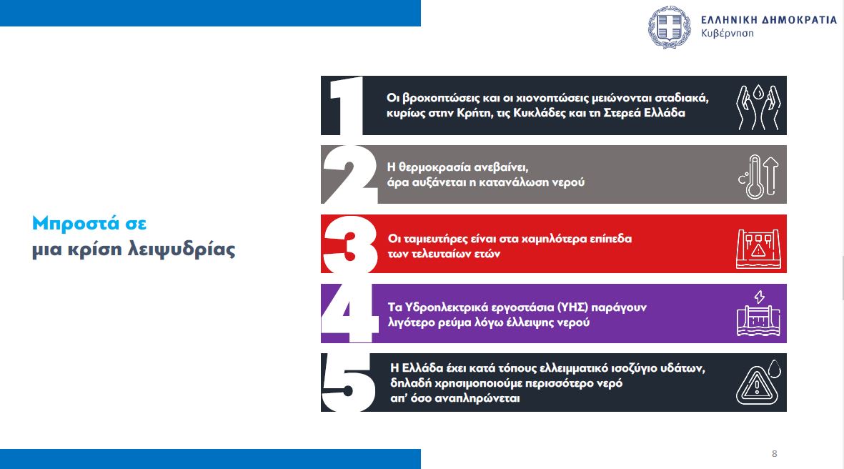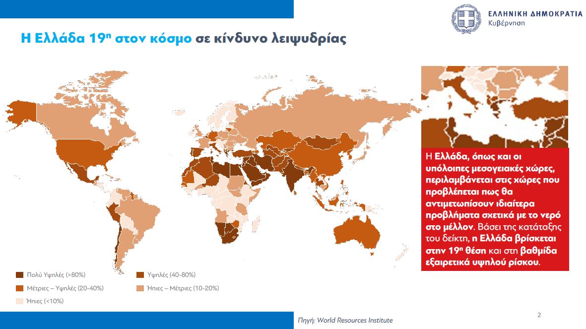 Με βάση τα στοιχεία, η χώρα μας κατατάσσεται στην 19η θέση παγκοσμίως ως προς τον κίνδυνο λειψυδρίας. Η στάθμη των φραγμάτων είναι σε ιστορικά χαμηλά επίπεδα, ενώ ενδεικτικό είναι πως τα αποθέματα στην Αττική έχουν μειωθεί πάνω από 50% σε σχέση με το 2022.