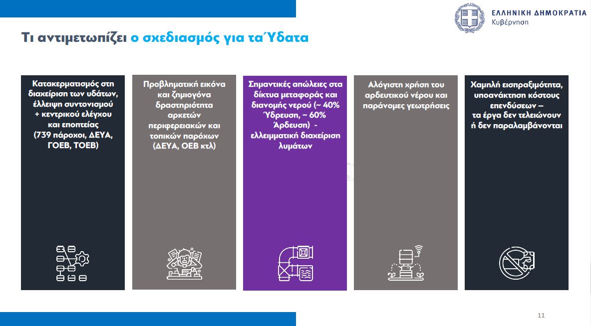 Υπό τα δεδομένα αυτά, αποφασίστηκε ένας ολιστικός τρόπος αντιμετώπισης του ζητήματος απέναντι στον κατακερματισμό, μεταξύ διαφορετικών φορέων, που υπάρχει σήμερα. Η κυβέρνηση πρόκειται να προχωρήσει σε ριζική αλλαγή του μοντέλου διαχείρισης των υδάτων στη χώρα, σε ένα πιο λειτουργικό σύστημα, με μεγαλύτερη αποδοτικότητα και περισσότερες επενδύσεις.