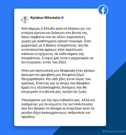 Με ανάρτησή του στα social media ο Πρωθυπουργός παρουσίασε το πλαίσιο για την εναέρια έρευνα και διάσωση στα βουνά της Ελλάδας με το νόμο του κράτους να παίρνει το όνομα του χαμένου ορειβάτη Θεοφάνη Ερμή.