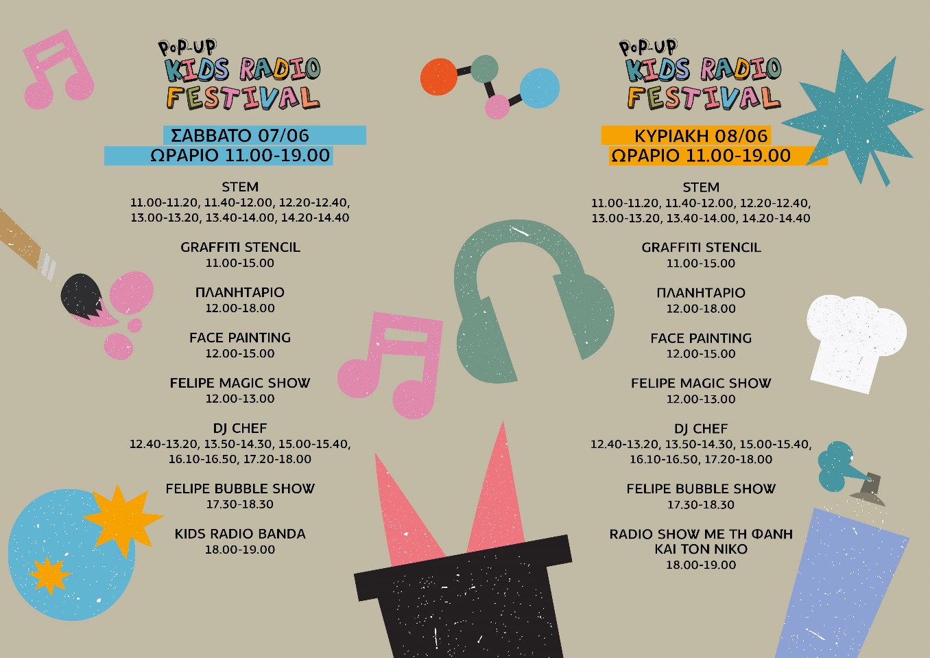 Σας περιμένουμε για να γνωρίσουμε από κοντά τους αγαπημένους παραγωγούς του Kids Radio 88.6, Φανή και Νίκo και να μας παρουσιάσουν το δικό τους Radio Show, να χορέψουμε παρέα με την Kids Radio Banda, να μάθουμε να φτιάχνουμε σχέδια με graffiti stencil από την ομάδα Imaginary Rooms, να ψυχαγωγηθούμε μαθαίνοντας με εργαστήρια STEM και το … κινούμενο πλανητάριο, να χαθούμε στη μαγεία και το bubble show του Felipe, να γίνουμε μικροί chef στο εργαστήριο μαγειρικής με τον DJ Chef Σπύρο Παγιατάκη, να δώσουμε χρώμα και φαντασία στα πρόσωπα των παιδιών με face painting και πολλές ακόμη εκπλήξεις!