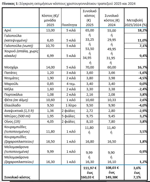 Από 111,97 έως 160,03 ευρώ, θα κοστίσει το εφετινό χριστουγεννιάτικο τραπέζι (6-8 ατόμων) σύμφωνα με την εκτίμηση του Ινστιτούτου Εμπορίου και Υπηρεσιών της Ελληνικής Συνομοσπονδίας Εμπορίου και Επιχειρηματικότητας (ΙΝ.ΕΜ.Υ.-ΕΣΕΕ).