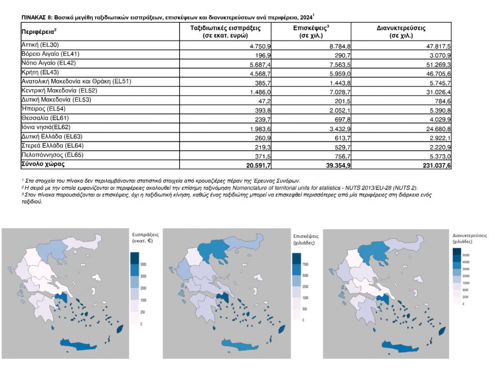 Όπως προκύπτει από την Έρευνα Συνόρων, οι ταξιδιωτικές εισπράξεις το 2024 διαμορφώθηκαν στα 20.591,7 εκατ. ευρώ. Ο κύριος όγκος των εισπράξεων (Πίνακας ), σε ποσοστό 89,7% του συνόλου, πραγματοποιήθηκε σε πέντε περιφέρειες, ως εξής: Περιφέρεια Νοτίου Αιγαίου (5.687,4 εκατ. ευρώ), Περιφέρεια Αττικής (4.750,9 εκατ. ευρώ), Περιφέρεια Κρήτης (4.568,7 εκατ. ευρώ), Περιφέρεια Ιονίων Νήσων (1.983,6 εκατ. ευρώ) και Περιφέρεια Κεντρικής Μακεδονίας (1.486,0 εκατ. ευρώ). Στο σύνολο των υπόλοιπων περιφερειών (Περιφέρεια Ηπείρου, Ανατολικής Μακεδονίας και Θράκης, Πελοποννήσου, Δυτικής Ελλάδας, Θεσσαλίας, Στερεάς Ελλάδας, Βορείου Αιγαίου και Δυτικής Μακεδονίας) οι εισπράξεις διαμορφώθηκαν στα 2.115,1 εκατ. ευρώ.