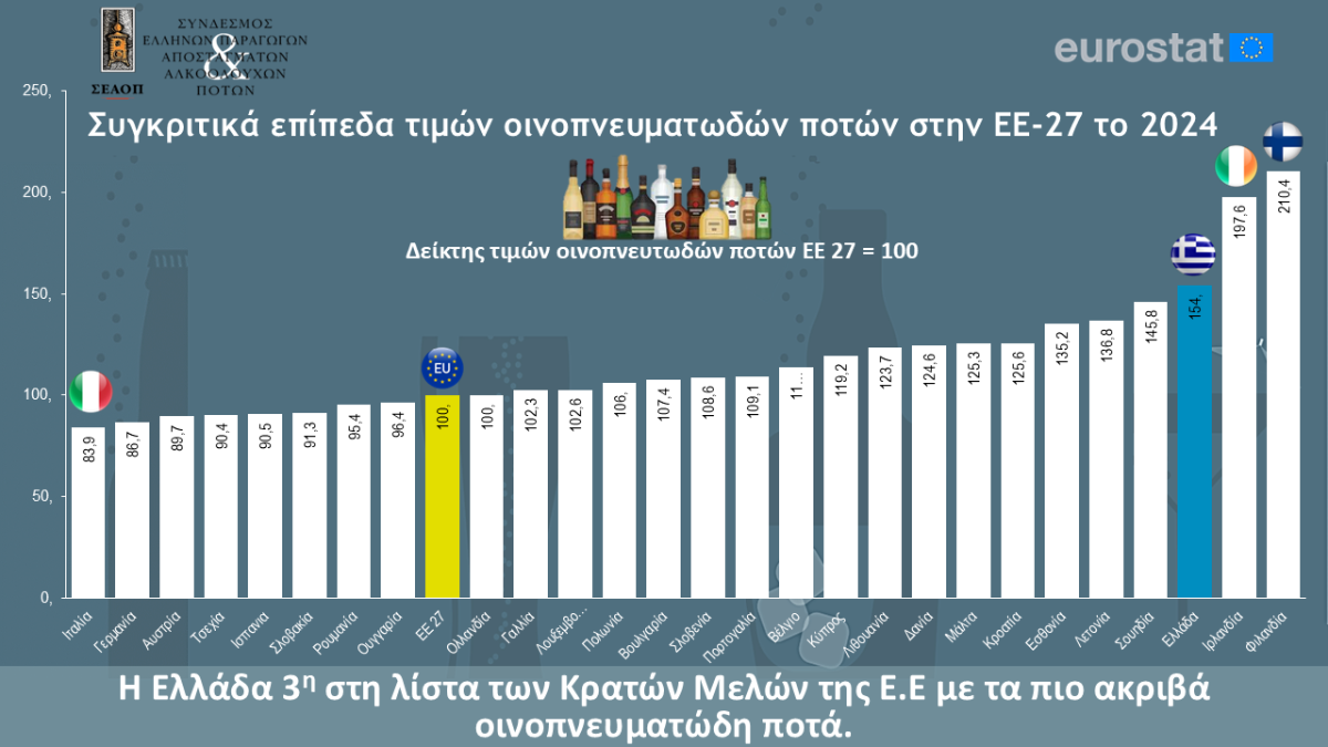 Μία από τις πιο ακριβές χώρες της Ευρωπαϊκής Ένωσης παραμένει η Ελλάδα ως προς τις λιανικές τιμές πώλησης των οινοπνευματωδών ποτών (αλκοολούχα, μπύρα, οίνος) το 2024, σύμφωνα με τα πιο πρόσφατα στοιχεία της Ευρωπαϊκής Στατιστικής Αρχής (Eurostat, Ιούνιος 2025) που επεξεργάσθηκε ο ΣΕΑΟΠ.