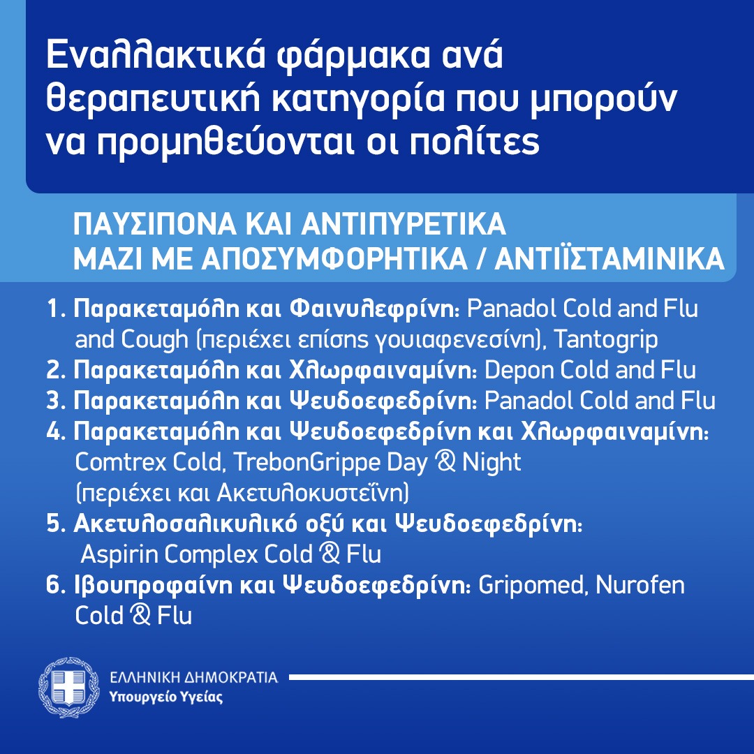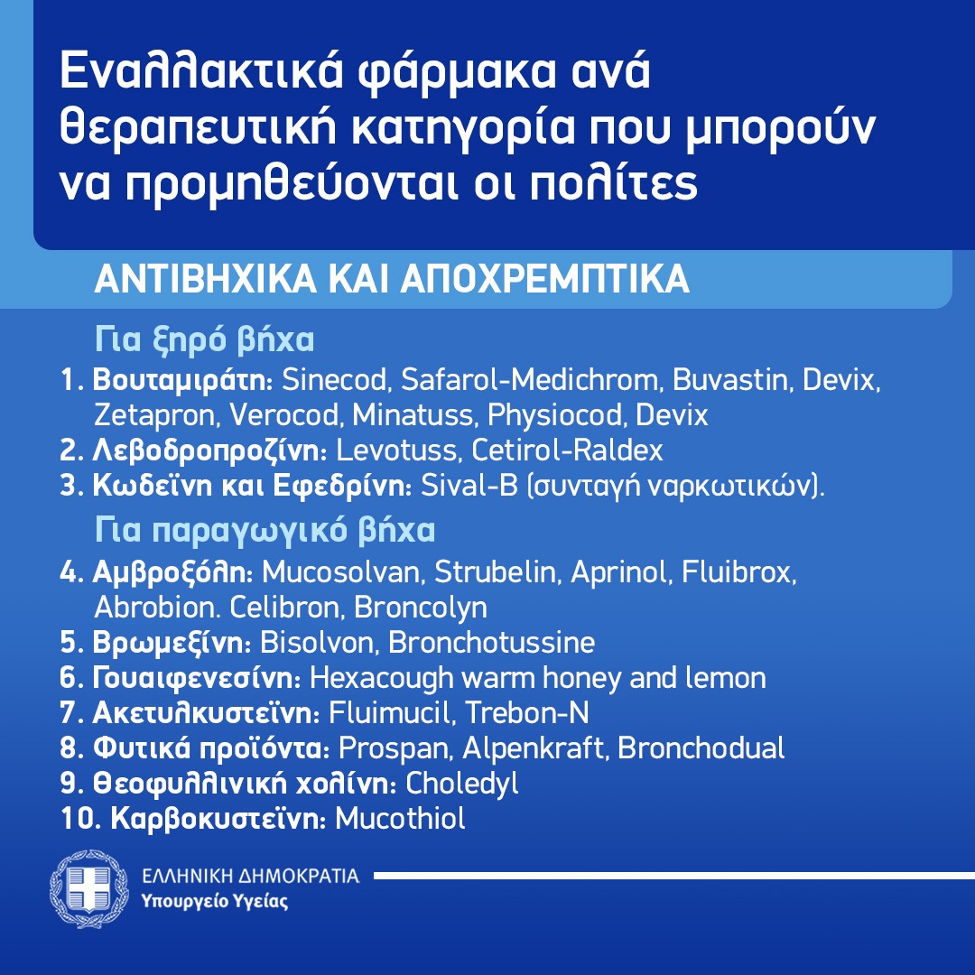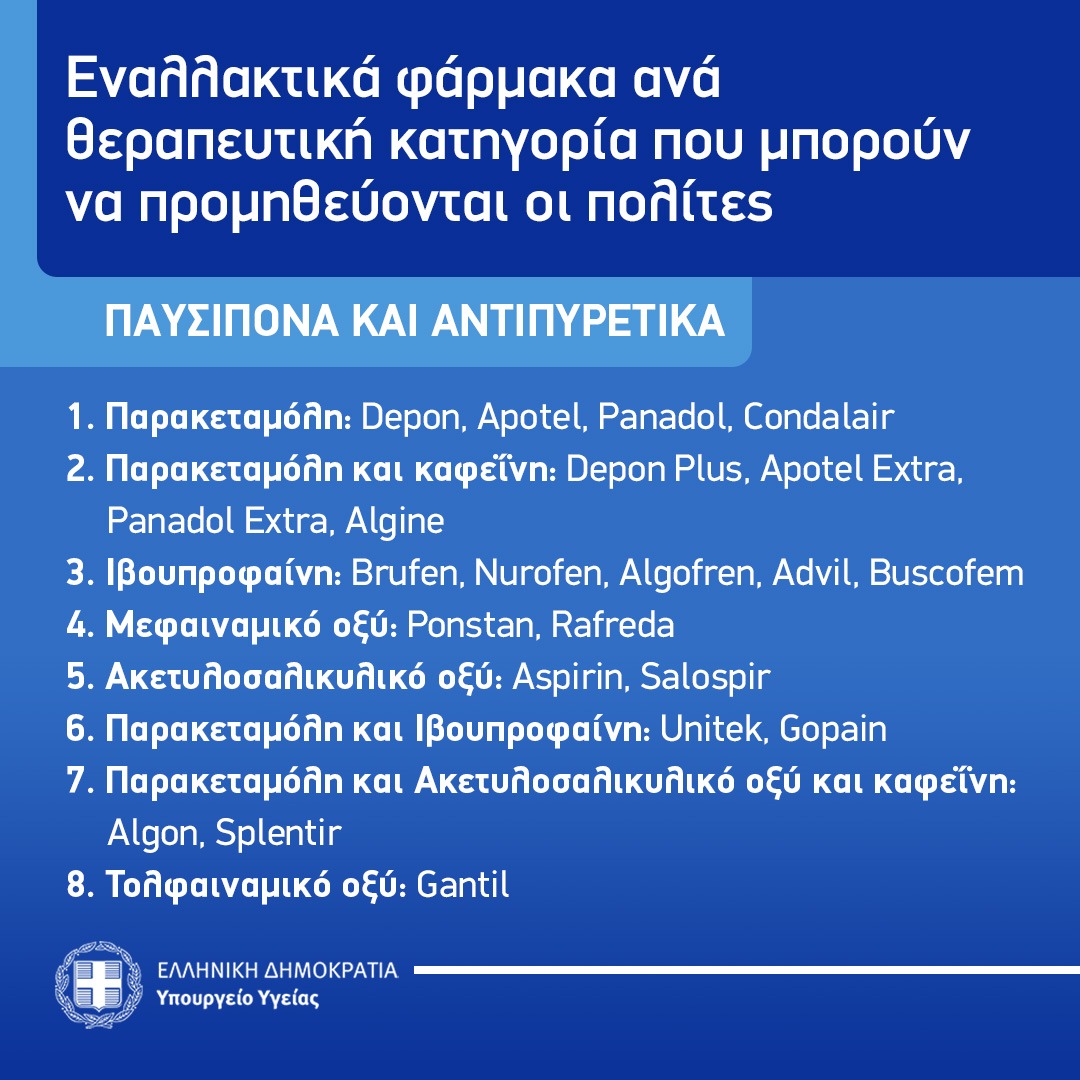 Ο Εθνικός Οργανισμός Φαρμάκων (ΕΟΦ), αρμόδια αρχή για την εποπτεία της επάρκειας της φαρμακευτικής αγοράς, ενημερώνει το κοινό σχετικά με τα εναλλάξιμα ανά θεραπευτική κατηγορία φάρμακα που μπορεί να προμηθεύεται από τα ιδιωτικά φαρμακεία, σύμφωνα με τον εγκεκριμένο από τον ΕΟΦ τρόπο διάθεσής τους. Στην περίπτωση που δεν υπάρχει το σκεύασμα που αναζητά ο πολίτης, ο ΕΟΦ προτρέπει να ερωτηθεί ο γιατρός ή ο φαρμακοποιός, ώστε να προμηθευτεί το αντίστοιχο σκεύασμα (ουσία, μορφή, περιεκτικότητα) που θα καλύψει τις ανάγκες του.