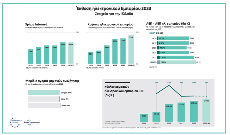 Ο Πρόεδρος του Ε.Β.Ε.Π. και μέλος της EuroCommerce, Bασίλης Κορκίδης, αναφέρθηκε στα στοιχεία για την Ελλάδα: «Τόσο το 2022 όσο και 2023, χαρακτηρίζονται από ένα επίμονο υψηλό πληθωρισμό, με αποτέλεσμα οι ευρωπαίοι και οι εγχώριοι καταναλωτές να είναι πολύ πιο ευάλωτοι στις τιμές βασικών αγαθών. Σύμφωνα με τον πίνακα της έρευνας (βλ. συνημμένο) και τα στοιχεία της Eurostat για την χώρα μας είναι εμφανές πως η χρήση του internet από το 79% του 2021 ενισχύθηκε σε 84% τη διετία 2022 και 2023. Από τις πιο δημοφιλείς μηχανές αναζήτησης με συντριπτικό μερίδιο 97% στην Ελλάδα ήταν η Google. Αντίστοιχα οι Έλληνες διαδικτυακοί καταναλωτές συνεχίζουν να αυξάνονται από το 51% το 2019 στο 70% το 2022 και στο 75% το 2023. Οι διαδικτυακές πωλήσεις B2C συνεχίσουν να αυξάνονται διαρκώς από τα 7,5 δις ευρώ το 2019, κατά 8-10% ετησίως, με εκτιμώμενο κύκλο εργασιών 17,33 δις ευρώ το 2023. Το ηλεκτρονικό εμπόριο, σύμφωνα με τα στοιχεία του ΔΝΤ για το E-GDP, ακολουθεί με ποσοστό συμμετοχής 7,9% την αύξηση του ΑΕΠ στην Ελλάδα. Οι καταναλωτικές συνήθειες αλλάζουν γρήγορα και η ελληνική επιχειρηματικότητα φαίνεται να προσαρμόζεται.»