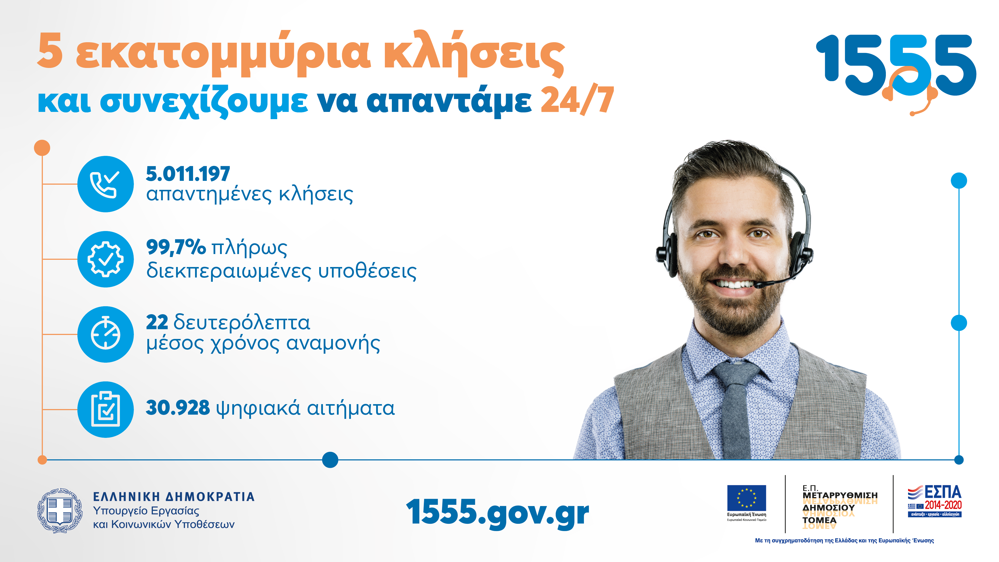 Περισσότερες από 5 εκατομμύρια κλήσεις έχει εξυπηρετήσει στους 18 μήνες λειτουργίας του το 1555, ο Ενιαίος Αριθμός Εξυπηρέτησης Πολιτών του Υπουργείου Εργασίας και Κοινωνικών Υποθέσεων.